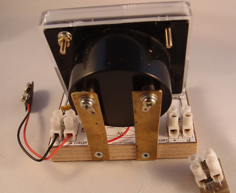 Här har jag modifierat ett stort 100µA instrument med inbyggd belysning. Lamporna byttes mot 6 st varmvita lysdioder. Vid testning av olika instrument så kunde det konstateras att flera var olinjära. De hade nog fått stryk i mekaniken. Upp till 5mA instrument fungerar klockrent. Med ett 10mA instrument så orkade inte PIC:en styra ut linjärt.