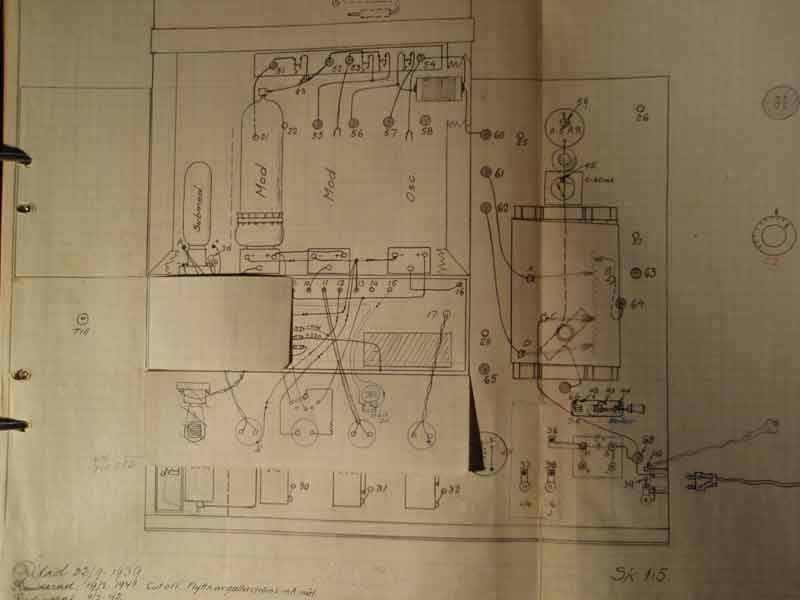 Om vi delförstorar ovanstående bild så går det att finna detaljer mot nedanstående schema. Alla nio rör enligt schemat, Flera av transformatorerna går att härleda. Rikstelefonen till höger, och cigarrlådan innehåller troligen mellantransformatorn till telefonlinjen. 300mA anodströminstrumentet med den stora Heissingdrosseln bakom. Sändaren är endast ett av rören, rör no 9 enligt schemat under och det ligger längst till vänster på bilden.. Lite suddigt, precis bakom skruvstycket. Det är lite större i dimension än övriga rör.