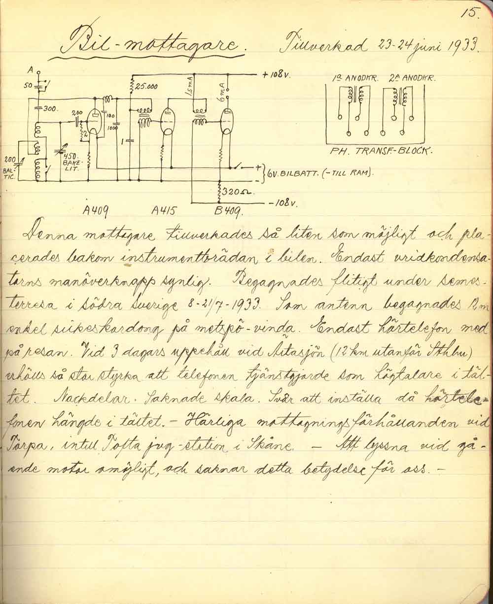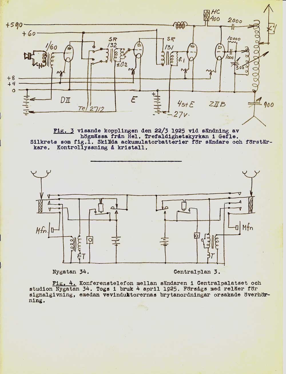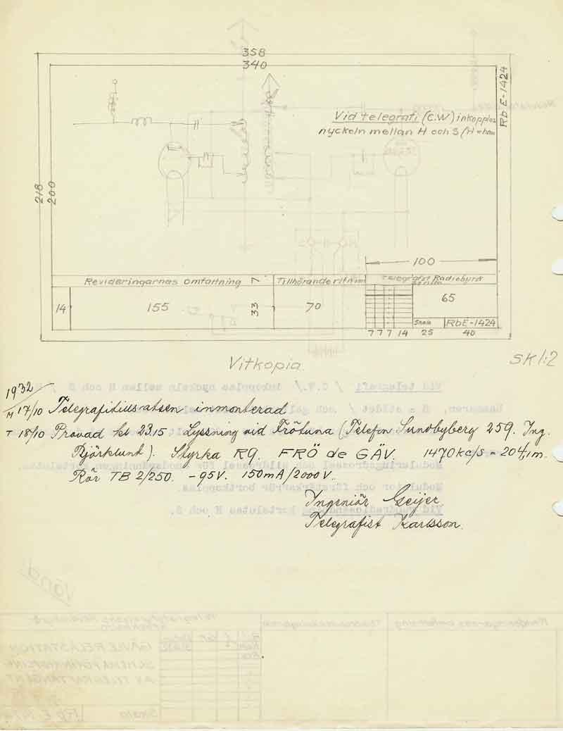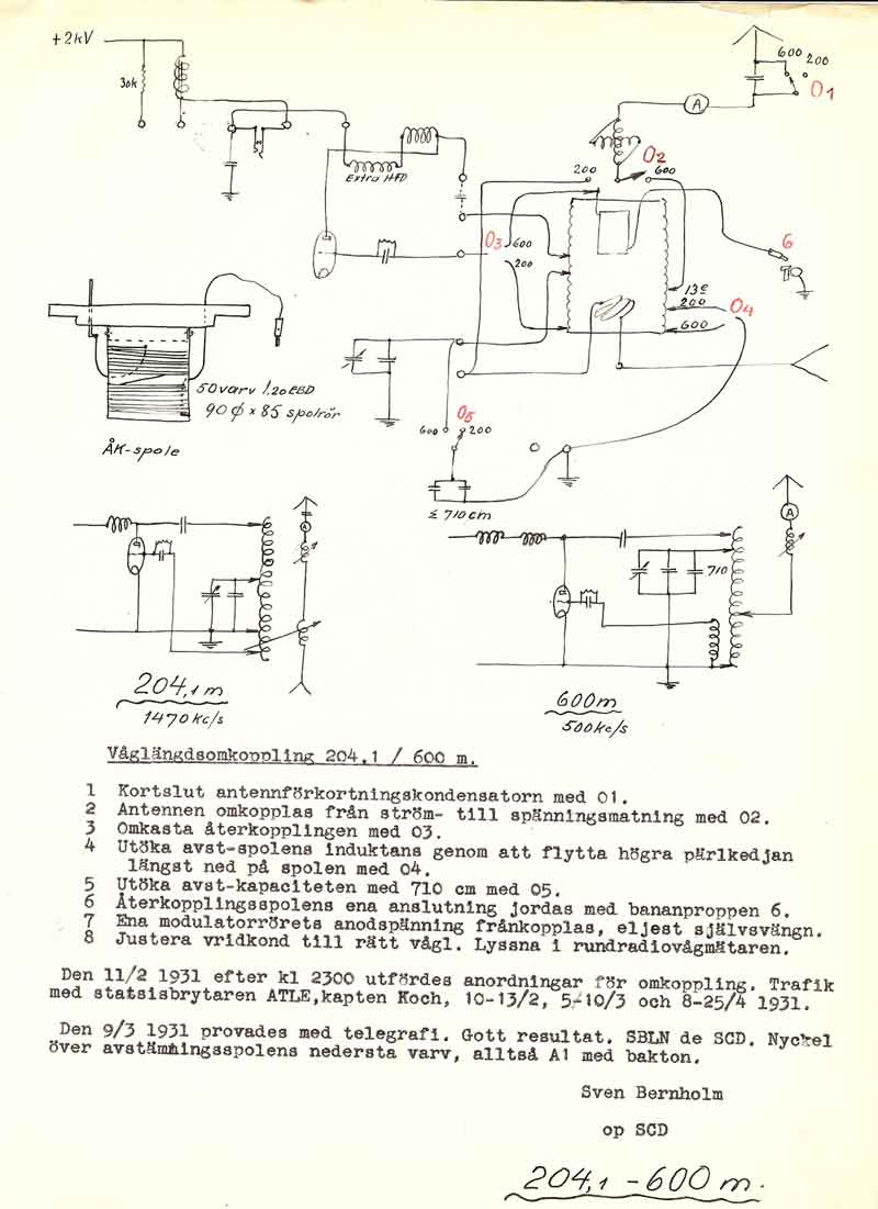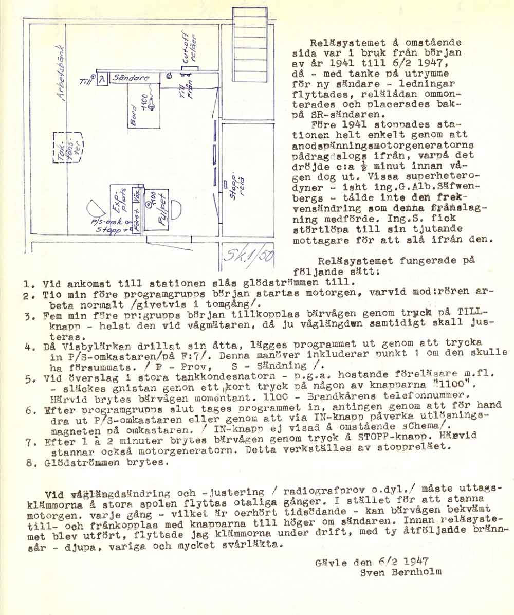 Gefle Rundradio SMXFI radions ungdom var det ofta lokala krafter som byggde ihop sändarna i varje stad, innan Televerket kom igång med statliga sändare.. Programmen bestod av lokala förmågor. Mottagarna ute i stugorna var nästan enbart kristallmottagare. Endast ett fåtal hade råd med radio som hade "lampor". Med kristallmottagare var räckvidden någon eller några mil, beroende på hur stora antenner som var till hands. I början var sändningarna sporadiska, kanske någon eller några timmar per kväll. Att sända på dagen under arbetstid var inte att tänka på. Och söndagar under gudtjänstid gick heller inte för sig... om det inte var gudstjänsten som sändes. Gefle Radioklubb bildades 1925 och drev sändaren ända till 1948 när Televerket tog över. Ny fjärrstyrd sändare monterades då av Televerket. Bernholm gick i pension 1953. Under andra världskriget fick lokalklubbarna inte sända egna program. Endast Sverige Radio fick återutsändas. Mellanvågssändaren släcktes 1972, och lyssnarna hänvisades till FM-sändaren. Den som var den tekniskt drivande personen var Sven Bernholm SM3RN. Han byggde en "labbuppkoppling" i en skrubb i lägenheten fyra våningar upp på Centralplan i Gefle. Första utsändningen med ca 10W var mitt i natten 14 mars 1925. En månad senare var nästa "labbuppkoppling" klar som klarade ca 100W. Gefle Radioklubb bildades, och var ansvarig för utsändningarna. Inom ett år hade klubben över 700 medlemmar. Så intressant var det nya mediet. Sven Bernholm SM3RN.När vi var några som byggde "Jones" sändaren under julhelgen 2007 så nämnde Karl-Olof, SM3CLA att han hade Jones Handbook 1938... på Svenska! Och det var Sven Bernholm som hade översatt. Sven avled 1963, men Karl-Olof hade då känt Sven sedan slutet på 1940-talet. När lägenheten efter Sven skulle städas var det ingen som tänkte på all den "bråte" som Sven efterlämnade, utan det skulle dumpas. Karl-Olof, då som nu, en ung alert man, fick erbjudande att plocka vad han ville och räddade mycket, men inte allt, till eftervärlden. Det var Sven's alla egenbyggda radioinstrument av olika slag. En del sparades dock inom familjen vilket ett sonson, Stig Bernholm idag har i sin ägo. Flera bilder kommer från honom. Bernholm var stationsföreståndare för rundradiosändaren i Gefle från 1925 till sin pension 1953. Varje kväll satt han och bevakade sändningen. För att fördriva tiden byggde han massor med instrument, gjorde ritningar på utrustningen, och, översatte engelska/amerikanska amatörradiohandböcker till svenska. Med all text och egna ritningar! Han verkar aldrig ha kastat ritningar som har blivit inaktuella efter ombyggnader. Utan då gjordes en ny ritning framför den gamla i pärmen. Därför har vi nu möjlighet att följa utvecklingen av radiostationen. Nu kan inte denna sida få äran att vara strukturerad.... Karl-Olof och Stig Bernholm matar mej med bilder, och jag lägger ut dem. Och... vi ska se om inte sidan borde hamna på en hemsida som har lite mer med Gävle att göra. Att den ligger på min hemsida (i Karlskrona) beror mer på att Karl-Olof och jag pratar med varandra flera gånger i veckan de senaste åren. Vi tyckte att denna skatt borde dokumenteras och visas. Om Bernholm var miljömedveten, eller om det var av ekonomiska orsaker, så återanvände han allt papper. Många av ritningarna, skisserna, är gjorda på baksidan av makulatur, som programtablåer, packsedlar, expeditionsordrar och modeteckningar. Det senaste irriterar min fru, som gammal modetecknare. Hon vill scanna "baksidan" medan jag vill ha ritningarna! Och allt detta gjordes innan A4 papper blev standard, som passar i en skanner. Dessutom skrev Bernholm ända ut i papperskanten. Scannrarnas format haltar lite här, så vissa ritningar blir tyvärr beskurna. Stig Bernholm (sonson) och Karl-Olof håller på och samlar bilder och information runt Sven Bernholms aktiviteter för rundradion i Gävle när det begav sig. De samlar och skannar just nu ur denna stora skatt. Bernholm efterlämnade flera pärmar med alla sina handskrivna dokument under sin tid som stationsföreståndare under 28 år. Här har alla tidningsurklipp samlats i en ostrukturerade ordning... tidningsnotiser men... massor med mb, tungt utan bredband! Det sändes inte dygnet runt som idag. Utan en stund på morgonen, kanske på lunchen. Men sen startade kvällssändningen vid 17...18 tiden fram till kl 22. Här är lite programtablåer från 1922. På baksidan av dessa har Bernholm sina anteckningar och ritningar. Därför har vi dem kvar idag!. Radiotjänst var lite snåla med att ange månad och årtal. Bernholm byggde många av sina instrument själv. Vi har samlat en del under denna länk. Hemmabyggda instrument Här är en länk till lite uppgifter om Gävle Rundradio