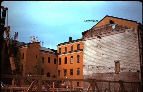 Det är knappt det synns, den igenmurade rektangeln som var utgången till antennen från sändaren. Här byggs Stadshuset om och till 1979.