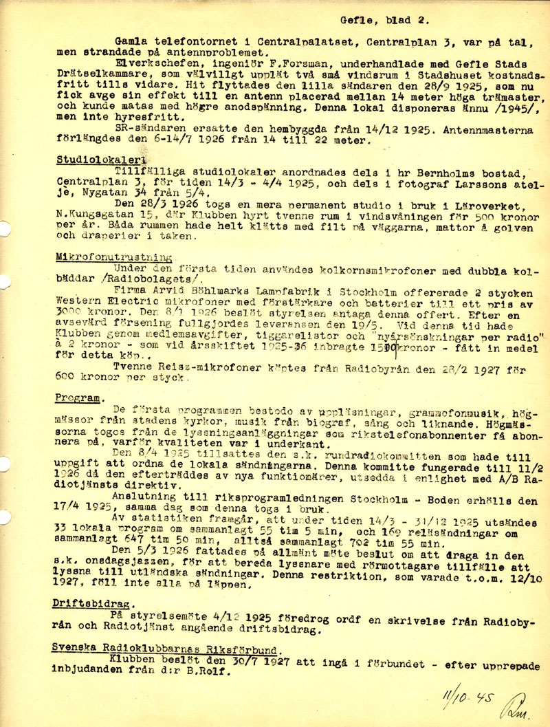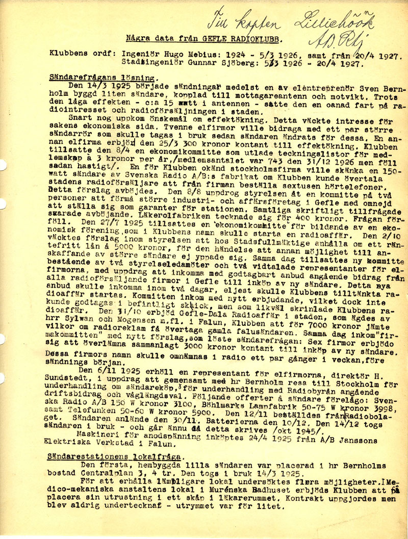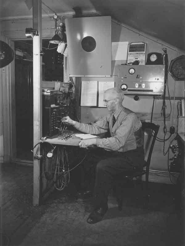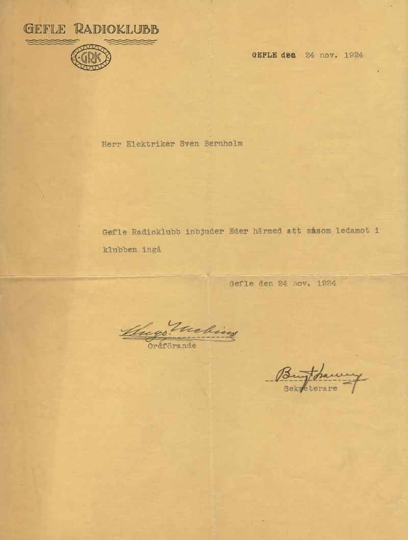 Hur började det?? Med sändningarna?I USA hade rundradiosändningar startat omkring 1919. RCA löste patentstrider, för här anades business med det nya mediet. Amerikanska försvaret gjorde stora ansatser om att få ensamrätt, monopol, på all radiotrafik!! Många av de tidiga uppfinnarna blev inblandade i långa och ouppklarade patenttvister. Det var svårt att hävda det unika, om det sen kom två världskrig emellan som drog fördelar av uppfinningarna så gick tiden. Armstrong, som ansåg sig både ha uppfunnit den regenerativa mottagaren och FM-systemet som vi än använder, slutade sina dagar som rättshaverist, och såg enda utvägen genom ett fönster från en skyskrapa i NewYork 1954. Efter första världskriget startade rundradiosändningarna i USA och intresset spreds med atlantångarnas hastighet över till Europa. Veckotidningarna började nu att publicera den ena fantastiska mottagaren efter den andra. Sven Bernholm i Gefle var en intresserad person som sparade urklippen från slutet av 1922 i sin klippbok (77mb!) Gefle Radioklubb startade 1924?? och Herr Bernholm inbjöds i klubben 24 nov 1924 som styrelsemedlem. Bernholm var nu 36 år, elektriker, och mycket radiointresserad. Han hade redan byggt avancerade rörmottagare under året. Och skaffat licens för att inneha radiomottagare. Klubben hade planerat en radioutställning till januari 1925. Men Gefle låg inom en "död zon" från sändarna runt Stockholm-Motala. Klubben fick sändningstillstånd för SMXF 16 jan 1925. Redan 14 mars 1925 hade Bernholm snickrat en liten 10W sändare hemma i bostaden och gick officiellt ut i etern. Om det var han som var spöksändaren tidigare i Gävle låter vara osagt. En antenn var spänd från bostaden på Centralplan till ett av kyrktornen. Tydligen var modulationen för svag, så två dagare senare var sändaren kompletterad med ett rör till. Söndagen den 22 mars sände han högmässan från kyrkan genom att abbonera på telefontjänsten. Kyrkan hade mikrofonutrustning för att ålderdomshem och andra som önskade kunna lyssna på tjänsten i telefon. Rent tekniskt så kopplades alla beställande telefoner upp på samma linje med följd att alla dessutom kunde tala med varandra. Nu hysshades åt hundar och åt alla som skulle vara tysta, väggklockor tickade dörrar slog, Allt gick ut i sändningen. De 10 watten täckte innerstaden gott, men det behövdes mer effekt. Redan inom en månad var det en ny labbkoppling på arbetsbänken, vi får nog kalla den för labbkoppling. Nu var det 9 rör i kopplingen och effekten höjd till kanske 100W?? I en skrubb i anslutning till lägenheten skedde utsändningen. Av praktiska skäl så blev vardagsrummet i Bernholms lägenhet studio, där alla föredrag och uppläsningar skedde, varvat med grammofonmusik. Bernholm hade en tålig hustru, men detta var ohållbart.Vid denna tid så byggde Televerket överföring av riksprogrammet via telefontråd till Sundsvall och Boden. Naturligtvis skulle denna linje "tappas" så att Gefle kunde höra riksprogrammet. Det hade varit mycket skriverier i tidningarna och prat i stugorna om det nya mediet. Så vad televerkaren hade förväntat sig när han drog in telefonlinjen till Bernholms skrubb, var nog något annat. För han stanna häpet i dörren och sa 'detta är lögn...det kan bara inte funktionera...' Nu kunde riksprogrammet sändas, men man bröt självmant om man ville sända egna program. Eller också bröts riksprogrammet när telefonstolparna välte på Uppsalaslätten under stormar. Den 23 maj -25 så blev det klart att klubben skulle få hålla till på en vindsskrubb i stadshuset gratis. Och få sätta upp en antenn över taken. 19 juni började mastbygget. Under tiden flyttades utrustningen till Carl Larssons fotostudio. Och den 28 september flyttades "labbsändaren" till Stadshuset. Intresset för radio var stort, det behövdes en bättre sändare. Genom rena reklamsändningar ökade klubben medlemsantalet. Offerter begärdes in. Man fick ett "gratiserbjudande".. mot att man köpte 6000 hörtelefoner! Radiobolagets anbud på 3.100:- antogs 12 november 1925. Sändaren var i drift 14 december -25. Snabbt marscherat.. Klubbkassan var nu tömd, genom uppläsning av jul och nyårshälsningar kom ett rejält tillskott, 1.500:-, så att en mikrofon och annat kunde inhandlas. Medlemsantalet var nu närmare 700 a 5:-. Idag kan vi bara anta att en kristallapparat var årets julklapp i Gefle 1925. Licensen kostade 3:-, och slarvade man med inbetalningen drogs man, helst gruppvis, till tinget och fick böta 25:- Klubbens ordförande/stationsföreståndare, Ingeniör H.Mebius, programsamordnare, kemigraf Bengt Larsson, Sändaransvarig elektrikern Sven Bernholm och Lundvall. Denne Lundvall som måste ha gjort en betydande insats i skötande av sändaren finns inte mycket skrivet. Senare sändes det ca 4000 timmar/år och det klarar inte en person. Klubben sköter nu sändningarna och man får del av licenspengarna som kommer in runt Gävle. Fortfarande har alla ett ordinarie arbete om dagarna, och sköter sedan sändningen på kvällsfritid. Det rör sig om några timmar per kväll. 1929 sade Bernholm upp sig från sin tjänst på Norrländska Elbyrån och blev heltidsanställd hos radioklubben. Nu kan man anta att han hade sitt liv uppe under plåttaket i Stadshuset. Till radionestet fanns det en trycknapp på var sida om ytterdörren, med varsin lapp 'Inga mottagare mottages för reparation'. Många ville komma upp om än det ena eller andra ärendet. Men bara de initierade fick reda på att de måste trycka på båda knapparna samtidigt för att dörklockan skulle ringa! Nu när radionverksamheten var uppbyggd och fungerade så föll medlemsanatalet drastiskt. Varför betala 5:-/år + licens. Klubben fick nu nästan enbart luta sig mot licenspengar från staten. Dessutom tyckte Gävle stad att klubben borde betala hyra. Det finns nu flera fotografier från 30-talet där Bernholm är lärare på 