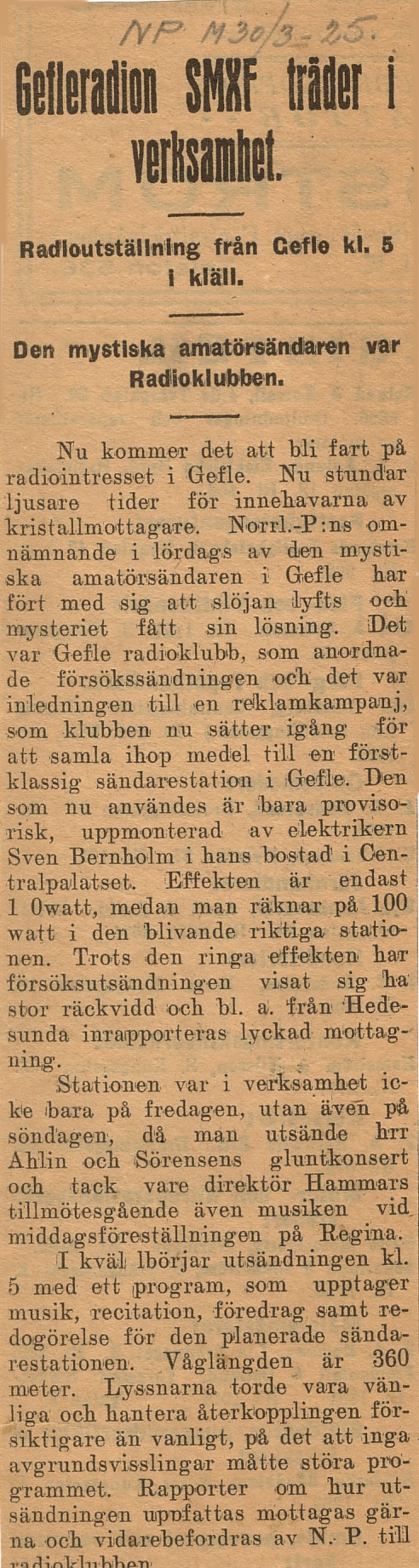 Det är på våren 1925. Gävleborna hör under flera kvällar och nätter underliga och starka utsändningar på sina kristall-radioapparater. Det förekommer artiklar i gävletidningarna om mystiska radioutsändningar. Under den tid experimentsändningarna pågår sker en livlig debatt i tidningarna. I Gävle fanns sedan 1924 Gefle Radioklubb. Dess ordförande, Ing. Hugo Mebius, ville skynda långsamt för att nå fram till bästa slutprodukt, en professionell sändare centralt placerad. Många ville fort ha igång utsändningarna från någon amatörbyggd sändare. En av dessa mystiska sändares byggmästare hade vid sändning omtalat att kostnaderna för hans sändarestation ”gått på mindre än 50 kronor” Elektrikern Sven Bernholm, Gävles egen radiopionjär, (då 37 år gammal) var en av ”de mystiska”, men som gjorde seriösa försök med sin hembyggda apparatur. Sändaren hade han inrymd i en ”skrubb” dvs en garderob i sin lägenhet, med adress Centralplan 3, fyra trappor upp. (ovanpå nuvarande CC-Pub:en och Centralbageriet) Hans första trevande försök gällde att sända endast en kortare sträcka, nämligen från skrubben till en radioapparat i vardagsrummet ! Styrelsen för den nybildade ”Gefle Radioklubb” fick höra talas om Bernholms experiment. Han var redan medlem i radioklubben och vidtalades nu att bygga en starkare sändare som kunde höras över hela stan. Helst längre. Bernholm hade redan i februari 1924 fått ”Kungl.Telegrafstyrelsens bemyndigande att uppsätta samt nyttja mottagningsanläggning för trådlös telegrafi eller telefoni”. Gefle Radioklubb hade sedan januari1925 Kungl.Telegrafverkets tillstånd att ”nyttja anläggning för telegrafering och telefonering utan tråd”. Stationens anropssignal skulle vara ”SMXF”. Alla formaliteter var alltså klara för att starta utsändningarna. Efter ett par veckor hade Bernholm kompletterat sin experimentsändare och den 14 mars 1925 skedde det första riktiga försöket. Detta var embryot till gävlebornas egna radiostation, vars 85-årsjubileum vi kan fira idag. Som studio fungerade familjens sovrum och antenntråden hade han dragit till Sjömanskyrkans torn, på andra sidan gatan. Programmet bestod av grammofonmusik och sändarens effekt var på 10 Watt. (Den kan jämföras med ung. den effekt en lampa i en adventsstjärna utstrålar !) Nu följde ett par veckor av experimenterande och utvecklingsarbete. Bernholm och ett par av hans vänner, Bengt Larsson och Axel Berglind, arbetade dag o natt med glödande intresse på förbättringar och justeringar. Så fort arbetsdagen var slut på kvällarna började man med radioexperimenten. Anteckningar från den tiden visar att man höll på till halv tre om nätterna… Pionjäranda ! Den 30 mars anordnades den första stora lokalsändningen med Bengt Larsson som hallåman. I programmet kom först ett par grammofonskivor och sedan deklamation av stadsingenjör Gunnar Sjöberg och redaktörerna Sjölund och Sterner, varefter radioklubbens ordförande, ingenjör Hugo Mebíus höll invigningstalet. Sändningen avbröts var femte minut. Man var nämligen ålagd, enligt sändarlicensen, att med jämna mellanrum meddela den anropssignal, ”SMXF”, som man tilldelats av Kungliga Telegrafverket. Detta medförde att ”…Herr Strömbom i Valbo ringde och undrade vem den där SMXF var…” I ”studion” (Bernholms sovrum) var man inte riktigt säker på bästa placeringen av mikrofonen och därför gjordes en del ändringar under sändningens gång. Bäst lät det, efter vad man kunde förstå av lyssnarnas reaktion, sedan mikrofonen hängts upp i en cykelslang i takkronan. När man så, på en lyssnares inrådan, stoppat stora vägguret var sändningen i det närmaste perfekt. Enligt dåtida begrepp. Radioprogrammen kom att bestå av uppläsningar, grammofonmusik, högmässor från stadens kyrkor, biografmusik, gluntsång mm. För att kunna överföra musik från biografen Regina (sedermera Royal och Friskis o Svettis) på Hattmakargatan 5, var man tvungen att dra ledningar över två gator. Polismyndighetens tillstånd måste inhämtas. Likaså för den ledning som senare drogs till hovfotograf Carl Larssons atelje på Nygatan. Bernholm och radioklubbens styrelse hade bråda dagar. Sändningarna hade alltså kommit igång, men Radioklubben hade större planer. Man utverkade tillstånd från AB Radiotjänst i Stockholm att koppla in sig på den telefonledning som förde stockholmsprogrammet till sändaren i Boden. Därmed fick man tillgång till Riksprogrammet. I det sammanhanget kan det vara värt att berätta om vår uppfinningsrike Bernholm. Han kom på hur man, utan att det märktes i radion, ljudlöst kunde koppla in sig på ledningen. Ja den saken blev så uppmärksammad att han fick förfrågan från Stockholm hur han tekniskt hade gått tillväga! Senare kom en av Telegrafverkets tjänstemän från Stockholm för att inspektera Gävles ståtliga radiostation. Han fördes in i sovrummet, stack in huvudet i garderoben och utbrast: ”Det är ju omöjligt att det här kan fungera”. Han kunde inte tänka sig att man med så provisoriska anordningar kunde åstadkomma radioutsändningar. Och ändå hördes det fint ute på stan. Ja man fick rapporter om att sändaren uppfattats t.o.m. i Hedesunda ! Den 17 april 1925 kunde Bernholm, från sin primitiva sändare, för första gången återutsända Stockholmsprogrammet till lyssnarna i Gävle med omnejd. Det kan nämnas att en stor del av materialet till den första sändaren skänktes av firman Norrlands Elektriska Byrå, där Bernholm var anställd. Sven Bernholm själv offrade mycket av egna pengar på sina experiment för att gävleborna skulle få sin sändare och kunna lyssna till radioprogramutbudet. Bernholms lägenhet blev för trång. Familjens sovrum kunde inte längre användas som studio. Hans familj fick utstå alltför mycket besvär med att ständigt vara helt tysta när sändni