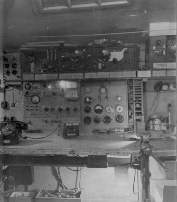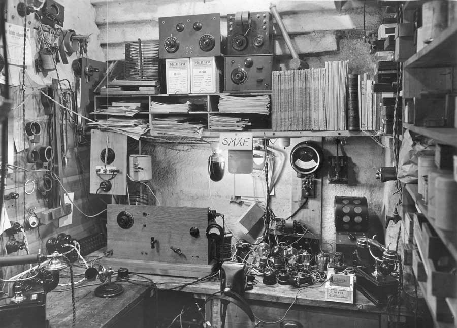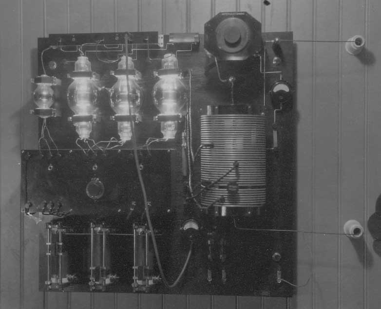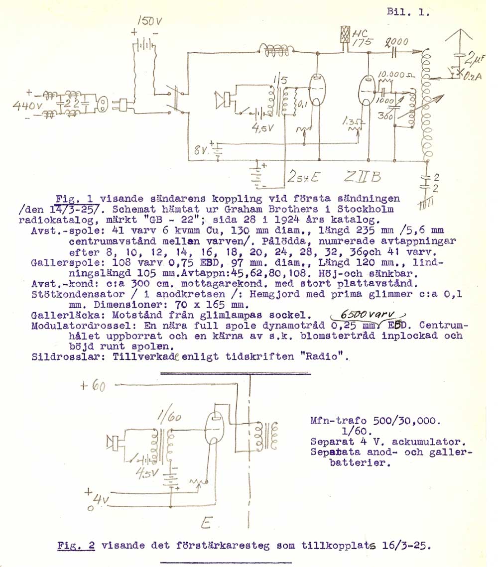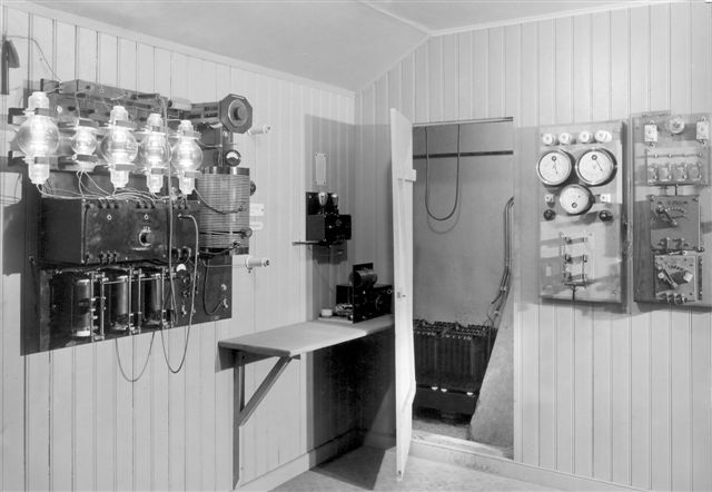 Sändaren 1925-?-? Här kan man se att det finns ett rör till jämfört med föregående bild. Modifiering... Rören lyser starkt, batterier i skrubben är för glödströmmen. Pådrag för motoromformarena till höger om dörren. Och bakom dörren sitter på väggen någon mikrofonförstärkare, och på bordet en kontrollmottagare. Inköpt från Svenska Radioaktiebolaget efter insamling av lokala medel. Frekvensen är nu 208 meter. Rören är av typ Marconi T250, Anodspänning 2000V och specade för 250W styck. Ett sändarrör, två modulatorrör och ett förstärkarrörr T50. Heissingmodulationen var enkel att bygga, men hade en usel verkningsgrad Generatorröret: Philips TB2/250 Ia 200mA Va 2000 Volt Antenmotstånd: 20 ohm Antennström: 3A Antenneffekt:180Watt Antennhöjd: 24 meter över balansnätet Call: SMXF Frekvens: 204,1 meter.