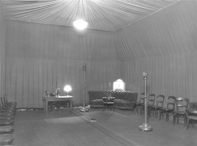 Gefle Rundradios första sändare i "skrubben". Mitt i natten mellan klockan 0l.00 till 02.30 den 14/3 -25 för första gången. Bernholm jobbade som elektriker dagtid, och denna hobby fick utföras kvällstid. Utöver de 440V från Elverket så lägges ytterligare 150V från egna batterier för att höja anodspänningen till 590V. På denna uppkoppling finns ingen bild. Tydligen räckte inte mikrofonförstärkningen så ett extra steg kopplades in två dagar senare. Vi kan vara glada att Berholm dokumenterade allt mycket noggrant. På bilden nedan från skrubben ser man en blyertspenna som hänger i ett snöre från taket. Effekten från denna sändare ca 10W.