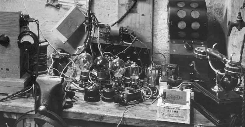 Andra sändaren i "skrubben" hemmaDetta var andra försöket... klicka på bilden för större version. Fotot föreställer Bernholms hembyggda sändare som han hade i sin lägenhet "i skrubben" på Centralplan 3. Denna andra sändare var i drift 26/4 1925. Den användes sedan till den 13/12 1925. Våglängd: 395 meter. Det var om denna sändare som en representant från telegrafverket förklarade häpen: "Det är ju omöjligt att detta kan funktionera" - och ändå hördes det ute på stan... Det var endast Sven Bernholm som bemästrade denna mängd sladdar. Televerket drog hit en telefonlinje så att "Riksprogrammet" kunde återutsändas. Riksprogrammet sändes på telefonkabel från Stockholm till Boden, och den "tappades" i Gävle. I april 1925 återutsändes riksprogrammet för första gången från denna "skrubb" Tillståndet var på 200W antenneffekt.