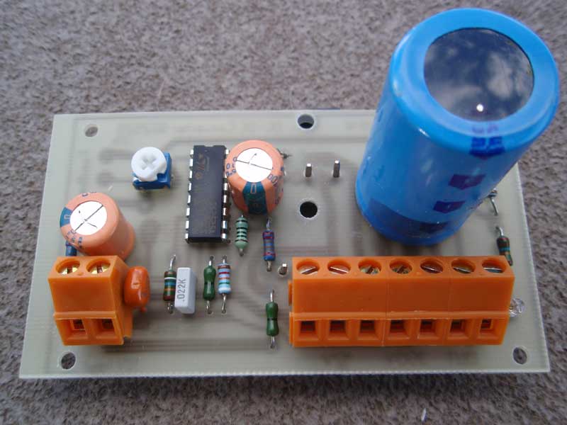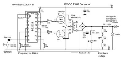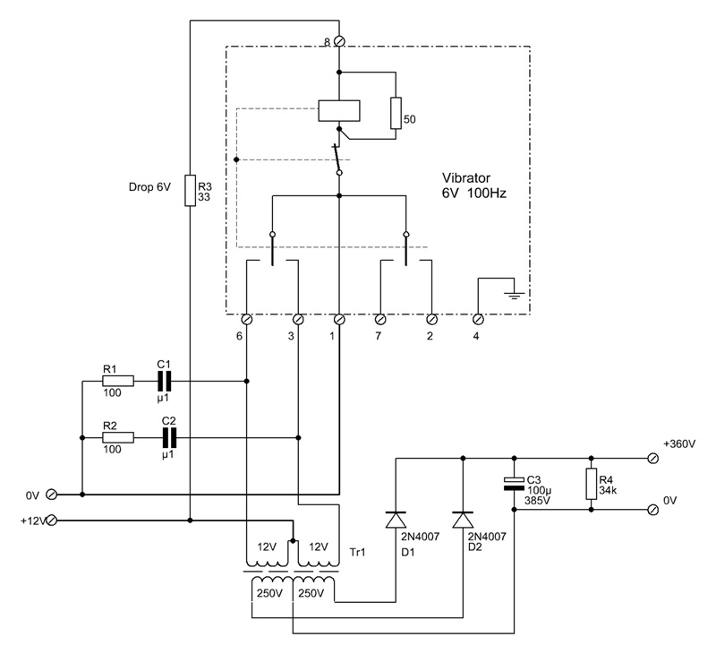 Like this I tested the vibrator. The dropresistor R3 is for 12V test run. The hash noise was not so bad in the receiver in spite of so few components.