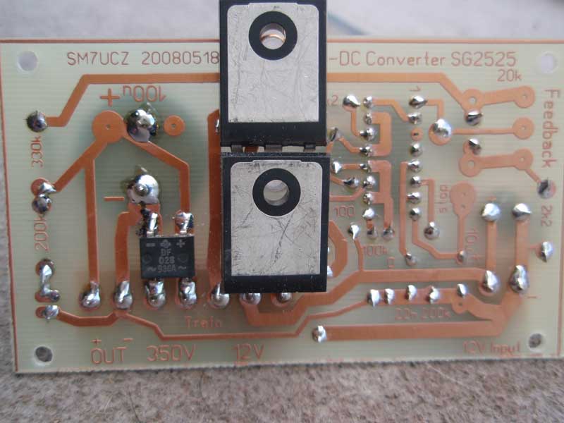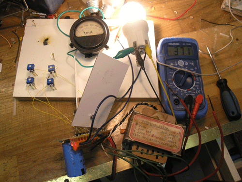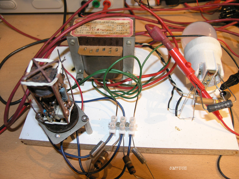 A test with a 15W 230V lamp. I decided to use 12V to my Paraset. Easier to find. The incurrent is about 2.2A and about 280V out. Idle voltage is about 350V at 0.5A in.