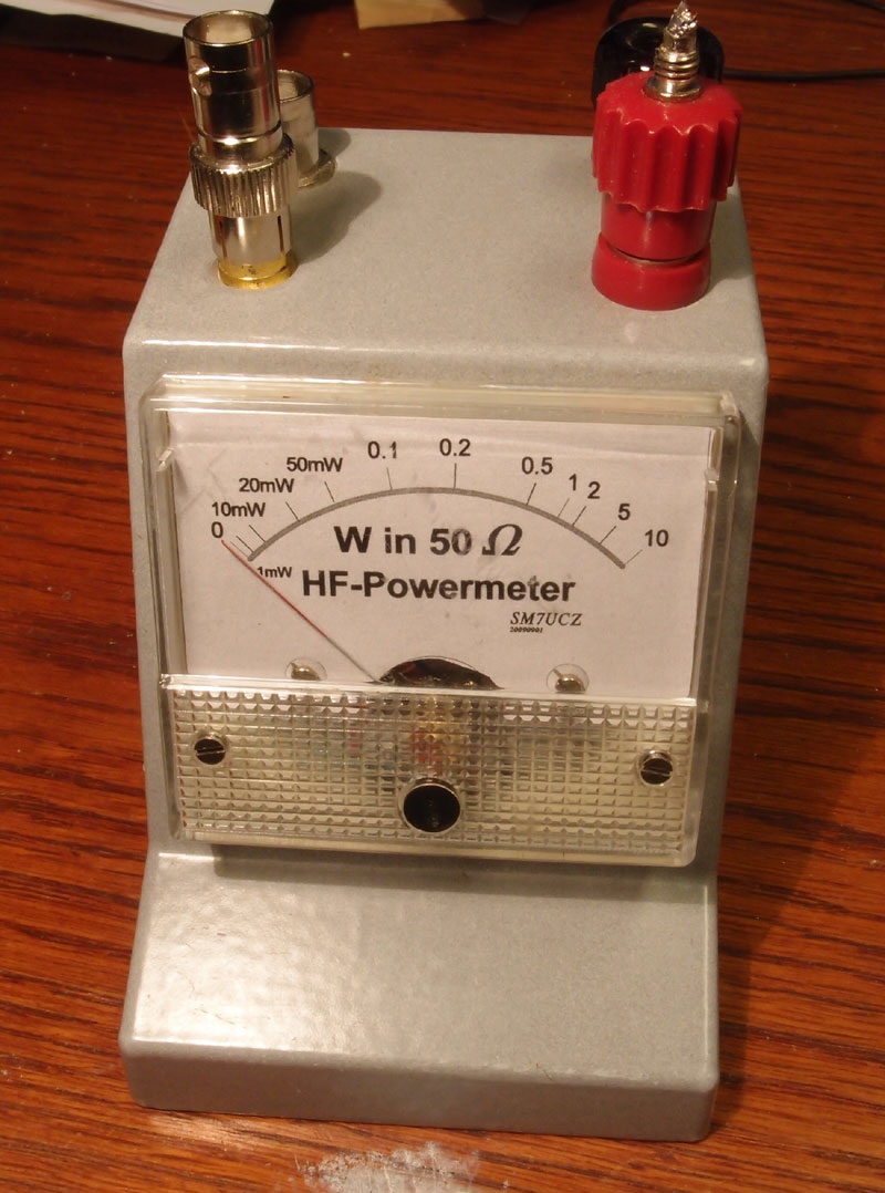 En expanderad QRP Power Meter monterad i en kasserad laboratoriepotentiometerpult. Ett mycket praktiskt instrument när man trimmar småsändare och oscillatorer. Nålen börjar att lyfta vid 1mW och fullt utslag vid 10W. Inga omkopplingar mellan olika effektlägen. Instrumentet är självförsörjande, inga batterier behövs.