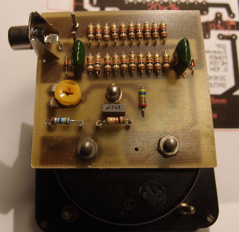 Kortet är avsett att fästas direkt bak på polskruvarna av ett 100µA instrument. För intrimning har detta kort försetts med socklar till motstånden R1 och R2. Två mätstift är monterade för oscilloskopets mätprobar på detta kortet.