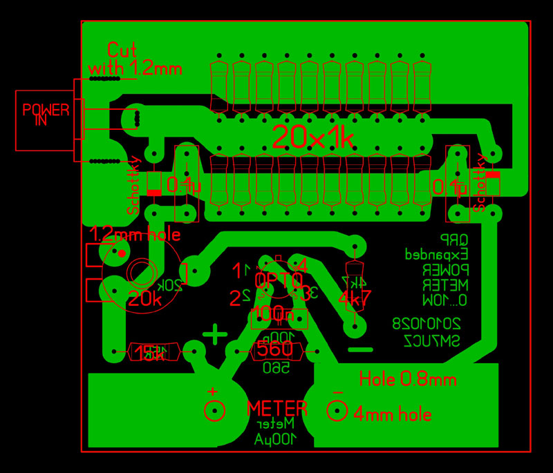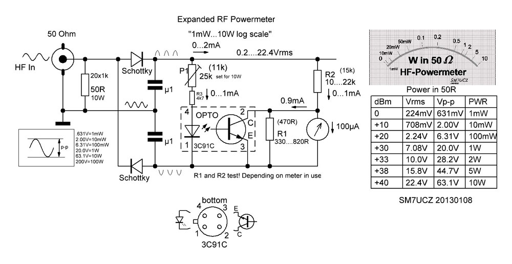 Funktionen blir till en expanderad skala med hjälp av en optokoplare. Ju mer HF-effekt som kommer in, så lyser lysdioden i optokopplaren mer på transistorn och shuntar 100µA instrumentet, så att det får svårare att nå maxläget. Genom att laborera med motstånden R1 och R2 så kan man dra och förskjuta skalan efter eget tycke. Därefter måste man rita en egen skala. Instrumentet börjar att lyfta visarenålen vid ca 1mW input och har maxutslag vid 10W. Med hjälp av ett oscilloskop och tabellen ovan kalibreras instrumentet.